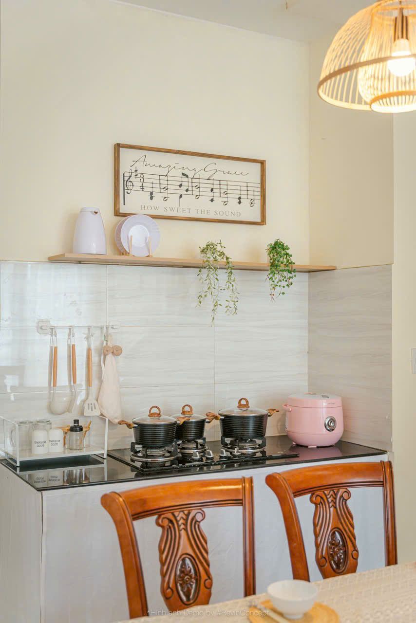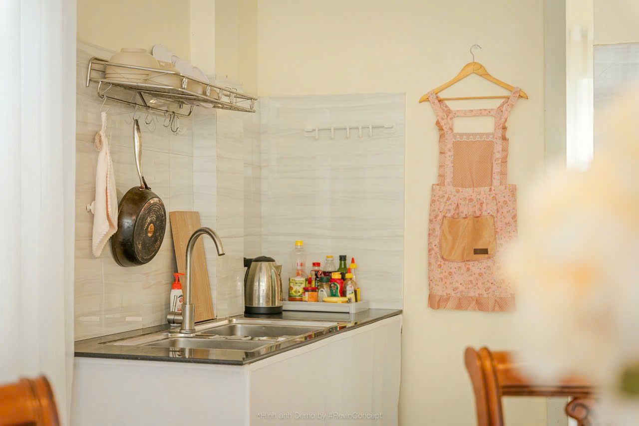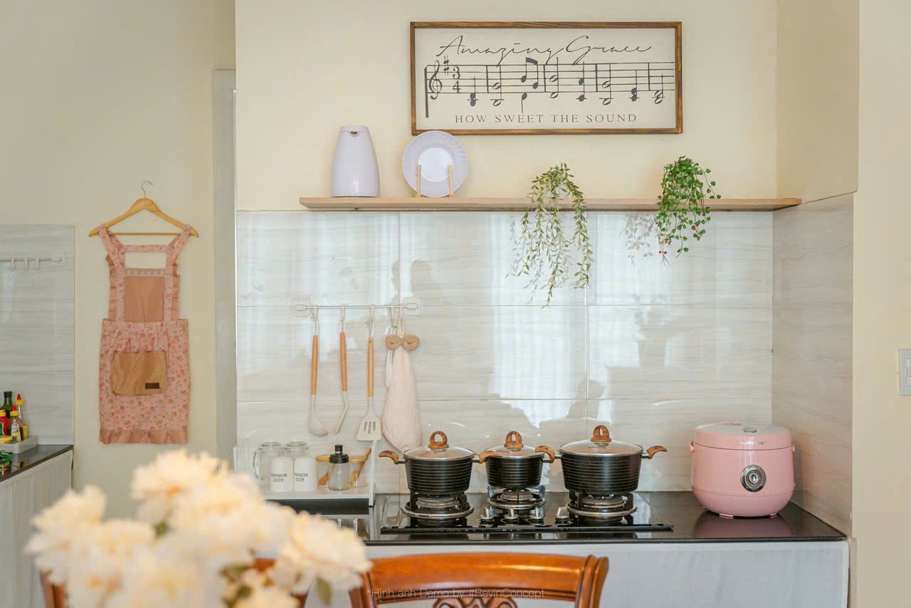 Phòng bếp đầy đủ dụng cụ và gia vị cơ bản
